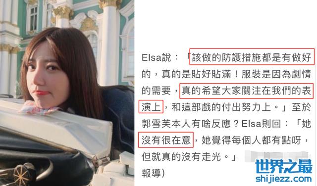 郭雪芙的经纪人也说到拍摄的时候该做的防护措施都有做好,衣服也是配合剧情,希望大家将注意力放到表演上。而被问到郭雪芙本人的反应时,经纪人也回应道她并没有很在意。从郭雪芙的反应来看,她的性格很是开朗大方。