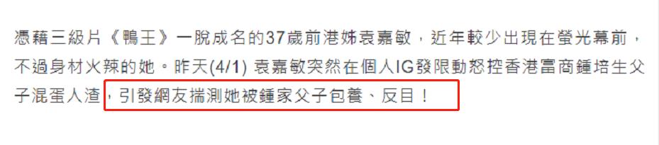 但之后袁嘉敏就鲜少出现在公众的眼前。而这次突然在社交平台发照片控诉钟家父子,引起众人猜疑,不知道是否被钟家父子包养,之后与钟家反目。