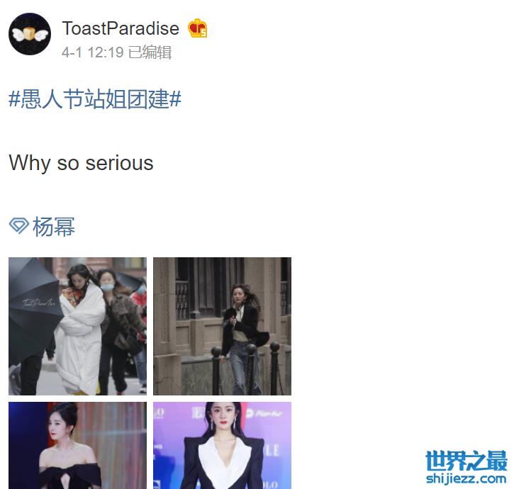 昨天是一年一度愚人节,各大明星粉丝个站团建,互发别的明星,其中不乏好友、对家、甚至是一些曾经的绯闻对象,因此还被不少网友称为“最勇站姐”PK日,一起来看看谁家更勇吧。