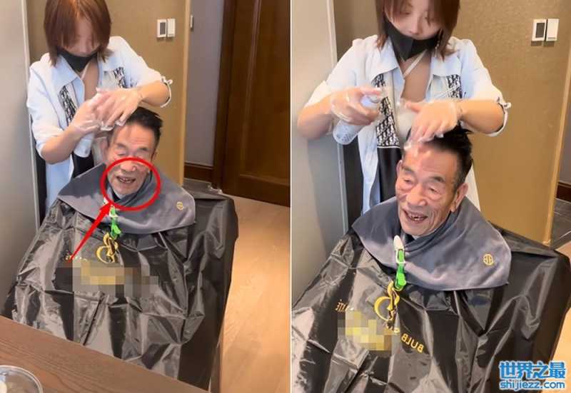 在视频中,现年90岁高龄的杨少华精神依旧矍铄,虽然身姿显得有些佝偻,但气色很好,面部红润。只见他坐在美发店的躺椅上,工作人员正在为他上染发剂,将白发漂染成黑发。而杨少华也非常享受,笑着的时候皮肤松弛明显,牙齿缺了一颗。