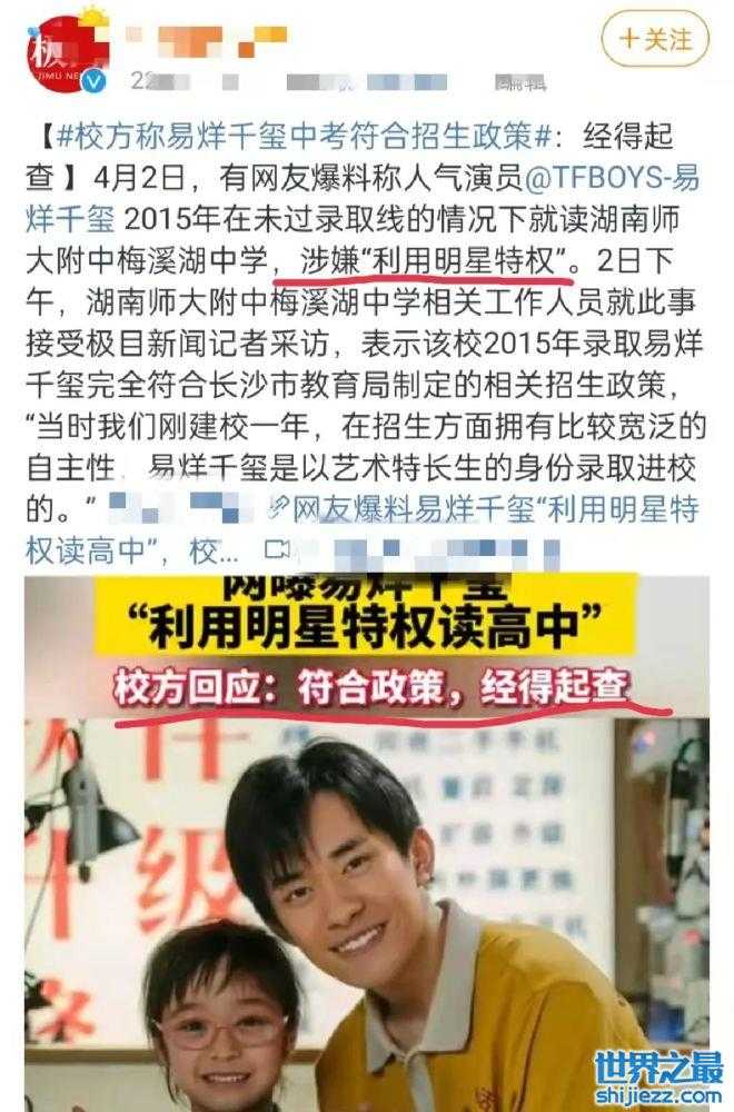有网友爆料称,“易烊千玺涉嫌中考违规,他是利用自己的明星身份考上的”,随后,校方回应,“易烊千玺的成绩经得起查,符合政策”。