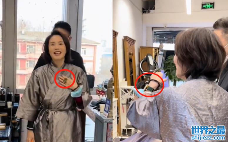 当天徐俐穿着类似于睡袍一样的外套,不知道是她自己的服装还是理发店的外套。徐俐手上超大的黑色戒指十分抢眼,她手腕上还带着一块大手表,从配饰便能看出来徐俐是一个很精致的人。