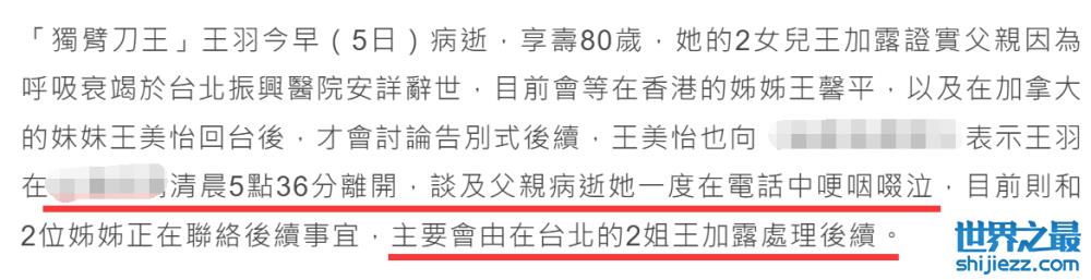 王羽病逝之后,台媒首先联系到二女儿王加露,在采访中,王加露透露父亲是在凌晨5点36分因为呼吸衰竭与世长辞的,在采访过程中,王加露语气悲伤,一度哽咽,可以看出父亲的猝然离去让她内心万分悲痛。据了解,王羽的丧礼等后续事项由三姐妹私下商议后决定,暂定由二女儿王加露担任主事。