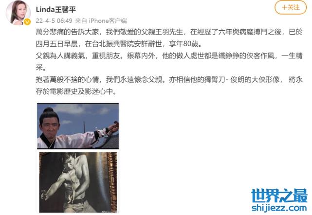 4月5日清明节,著名演员王羽与病魔斗争6年后在医院安详辞世,享年80岁,大女儿王馨平发文公开父亲去世的悲痛消息,她透露父亲一生活得精彩,为人处世是铁铮铮的侠客作风,抱着万般不舍的心情怀念父亲,也相信他的大侠形象永存影迷心中。