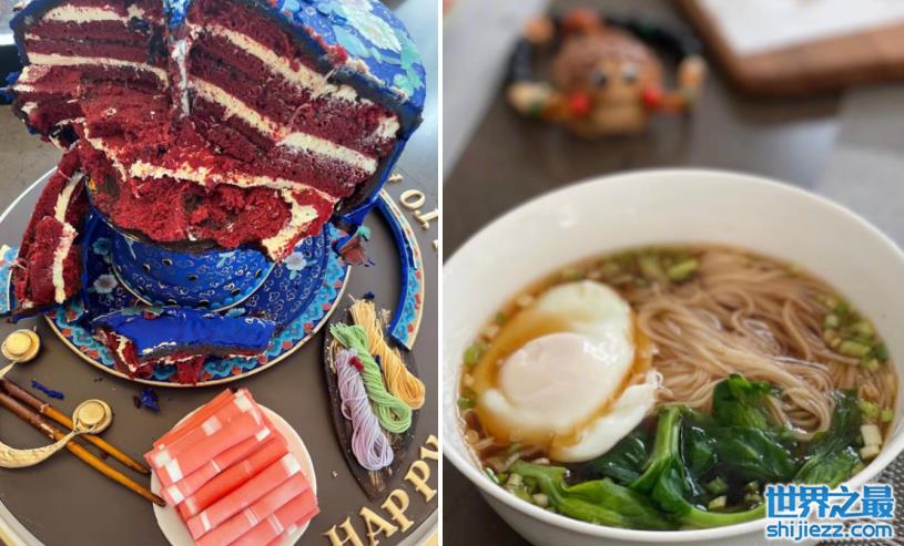 不得不说,这个蛋糕做得真是十分逼真,看上去与火锅并无二样,但切开来才能知道,这实实在在是一个蛋糕,看上去很美味。除了火锅蛋糕之外,林依轮还晒出了一碗面条,想必这也是他老婆为他制作的长寿面。