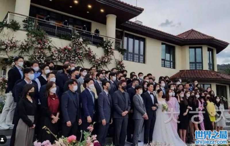 仔细看整个邀请的宾客合影之中,孔刘是站在第一位的中间位置,好像是和张东健站在一起,这也足见孔刘似乎是以伴郎团的身份现身在孙艺珍的婚礼上面。