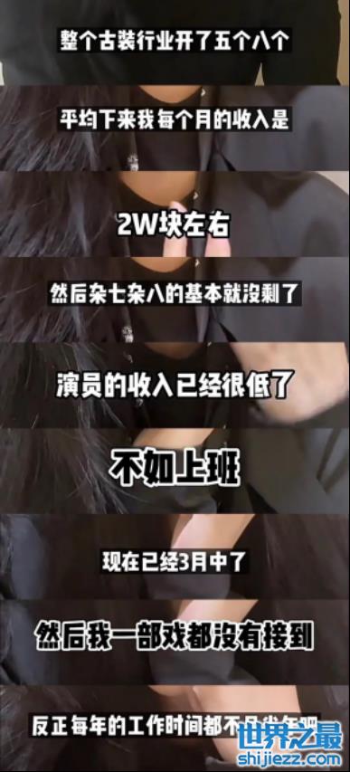 她称演员收入已经很低了,杂七杂八的基本就不剩,还不如上班,现在已经3月中了,然后一部戏都没接到。还称自己每年的工作时间都不足半年,这番哭穷言论引起了热议。