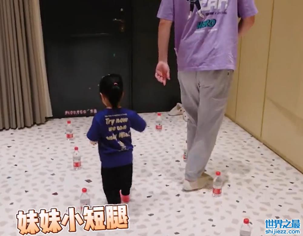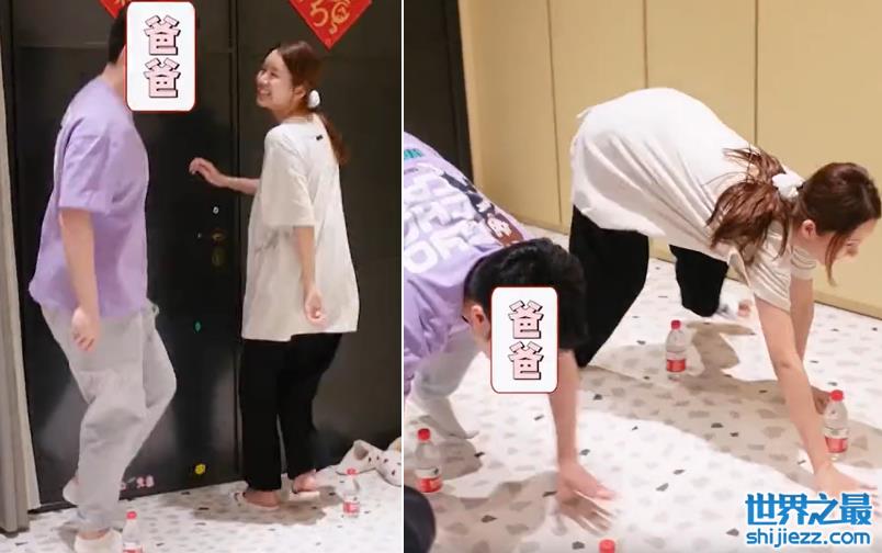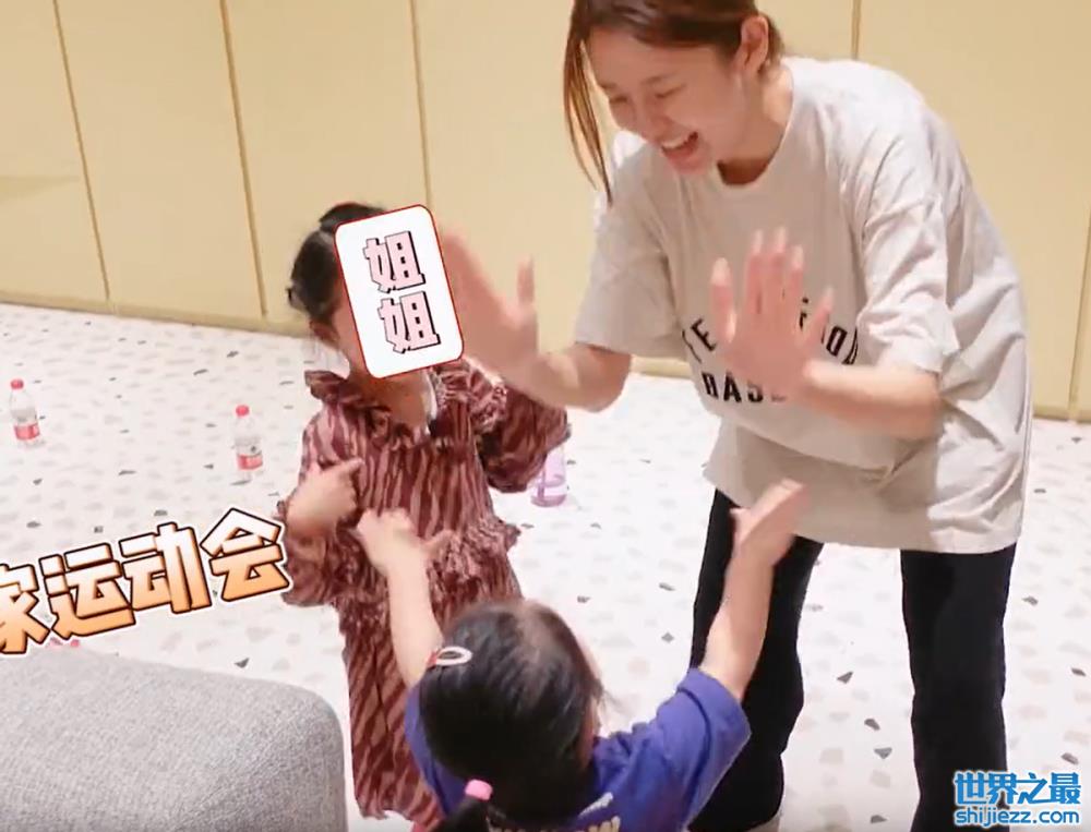 一开始,张子萱和自己的大女儿安安比赛,绕过障碍物往返跑,返回时两人都在地上爬,画面十分搞笑,两人都玩得很起劲。