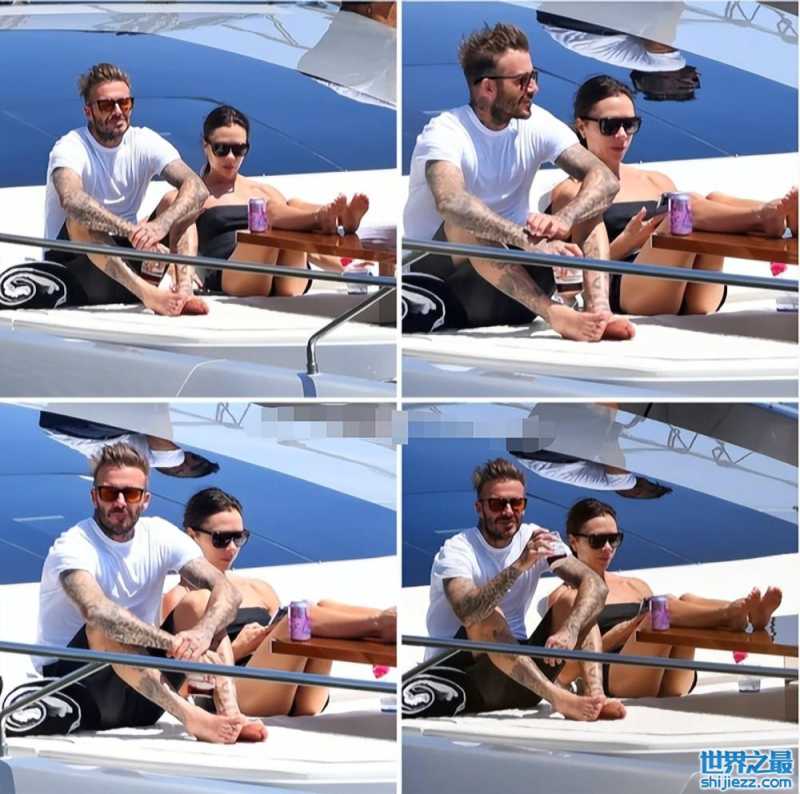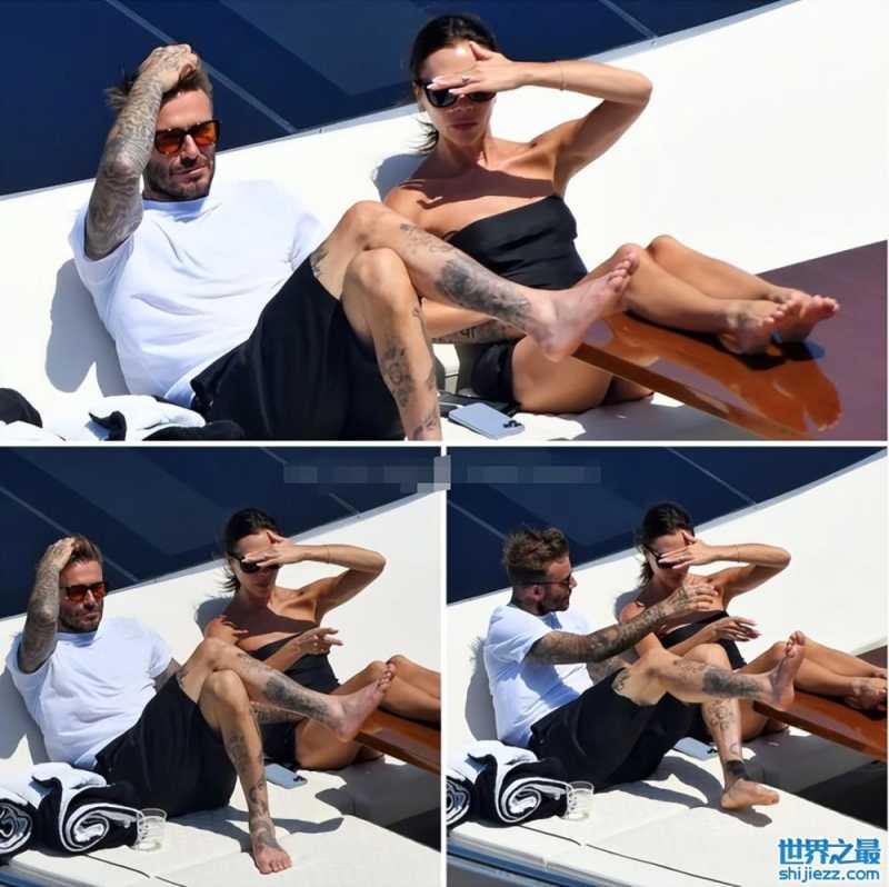 照片中,贝克汉姆与维多利亚坐在游艇的甲板上晒太阳,只见贝克汉姆穿着一件白色T恤搭配黑色短裤,戴着棕色墨镜,翘着二郎腿半躺在甲板上,十分悠闲。而一旁的维多利亚则穿着一件黑色裹胸背心,大秀苗条好身材。