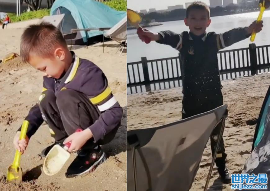 儿子和小伙伴在一旁挖泥沙,拿着小铲子全程嗨玩,兴高采烈的模样看起来颇有感染力。