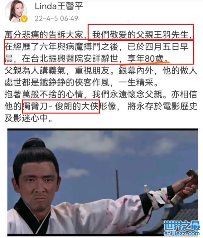 4月5日,歌手王馨平发布讣告,表示父亲王羽离世。由于疫情管控,王馨平被困在加拿大,未能送父亲最后一程,这位“独臂刀王”就这样离世了。