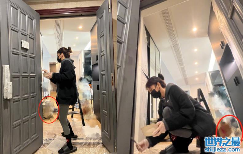 另两张照片里秦岚神情专注,很是投入于大门改造中,甚至为防止弄脏实木地板,她细心地铺上塑料薄膜。同时也无意中曝光豪宅一角,但令人意外的是豪宅内景稍显凌乱,银色的行李箱随意放置在玄关前,角落上还有快递箱子和白色拖鞋。