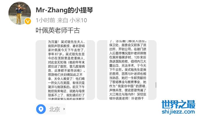 最后徒弟还直言吴式锴先生是他的恩师,因而与叶老师也相当熟悉,她把一生都贡献给了歌唱事业与教育事业,她作为“我爱你中国”的原唱,声情并茂,使这首歌传遍了大江南北和海内外,深切哀悼叶佩英老师,叶老师千古。