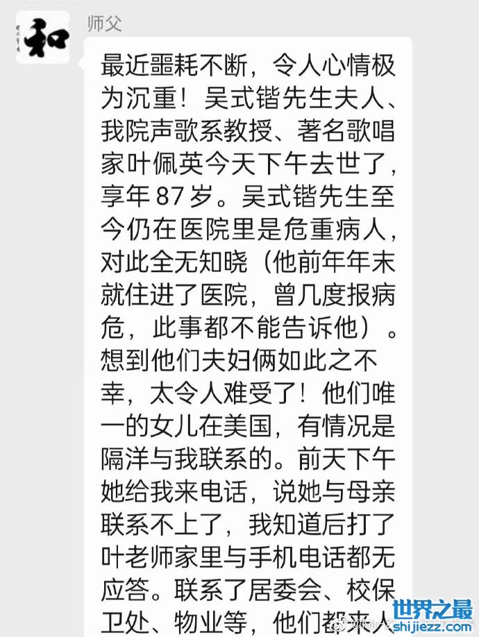 徒弟直言最近噩耗不断,令人心情极为沉重,吴式锴先生夫人,我院声歌系教授、著名歌唱家叶佩英今天(4月7日)去世了,吴式锴先生至今仍在医院里是危重病人,对此全无知晓,徒弟还透露说,叶佩英的老伴前年年末就住进了医院,曾几度报病危,所以叶佩英去世的消息还瞒着他,也是怕他得知后伤心难过导致病情严重。