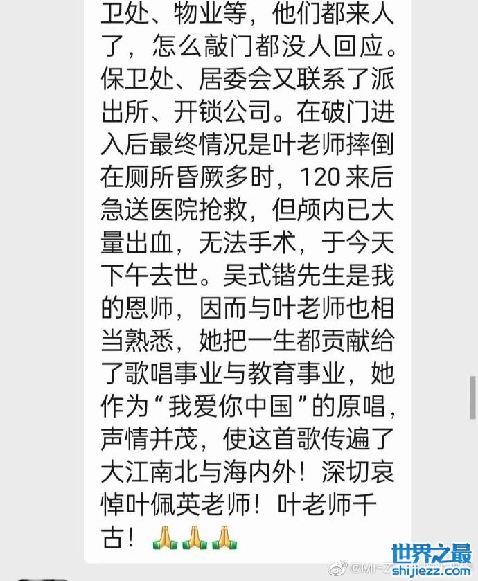 徒弟公开了叶佩英老师去世的细节,是唯一的女儿联系不上妈妈后,打电话联系了他,说她和母亲联系不上了,徒弟得知后打了叶老师家里和手机电话都无应答,最后联系了居委会、校保卫处、物业等,他们都来人怎么敲都没人回应,最后又联系了派出所和开锁公司,在破门进入后最终情况是叶老师摔倒在厕所昏厥多时,被送往医院抢救时,颅内已经大量出血,无法手术。