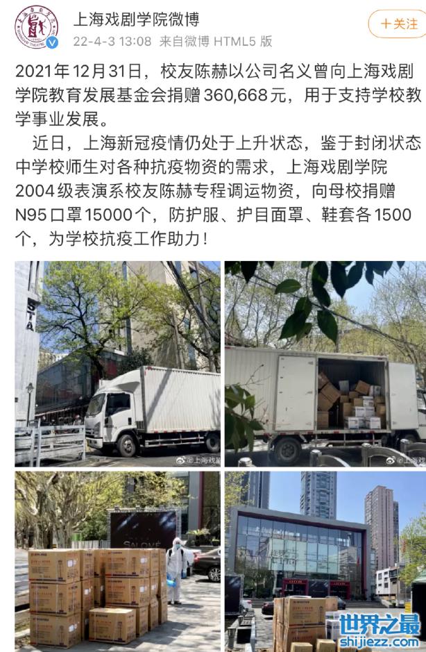除了陈龙外,近日,上海戏剧学院官方微博公开表彰陈赫,感谢其为母校上海戏剧学院捐赠抗疫物资,其中包括,N95口罩15000个,防护服、护目面罩和鞋套各1500个,为此,陈赫还专程调运物资,可谓是用心出力。