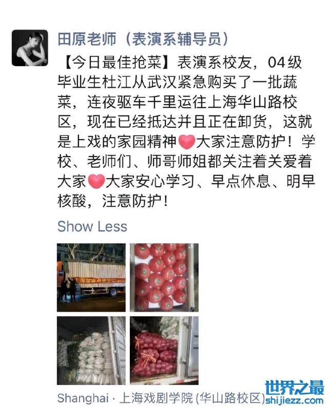 除此之外,演员杜江也向母校上海戏剧学院投送生活物资,据悉,得知上海目前蔬菜销售紧俏,杜江特意购买了一批蔬菜,连夜驱车千里运送到上海华山路校区,满满一卡车的蔬菜无疑解决了学校当下的燃眉之急。