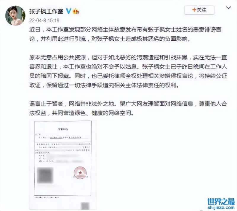 工作室原文:近日,本工作室发现部分网络主体故意发布带有张子枫女士姓名的恶意诽谤言论,并利用此进行引流,对张子枫女士造成极其恶劣的负面影响。原本无意占用公共资源,但对于如此恶劣的污蔑造谣和引战抹黑,实在无法一直容忍和退让,本工作室也绝对不会予以姑息。张子枫女士已于昨日晚间在工作人员的陪同下报案。
