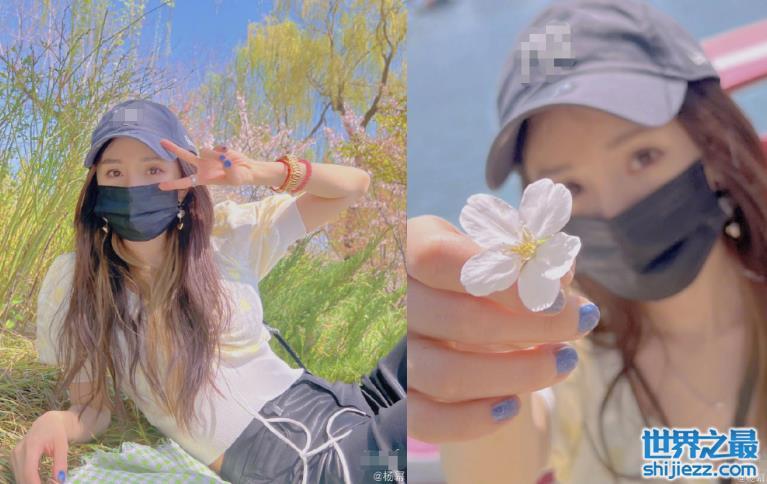 图片中杨幂披散秀发,身穿短款上衣搭配深灰色皮裤尽显曼妙的身材曲线。她戴着黑色棒球帽和口罩,露出精致具有辨识度的眉眼,一边手撑在草地上,另一边手则是摆出招牌的可爱手势。在春意的映衬下,更令她增添几分明媚照人。随后她捏着花花靠近镜头,留下最有春日气息的一幕。