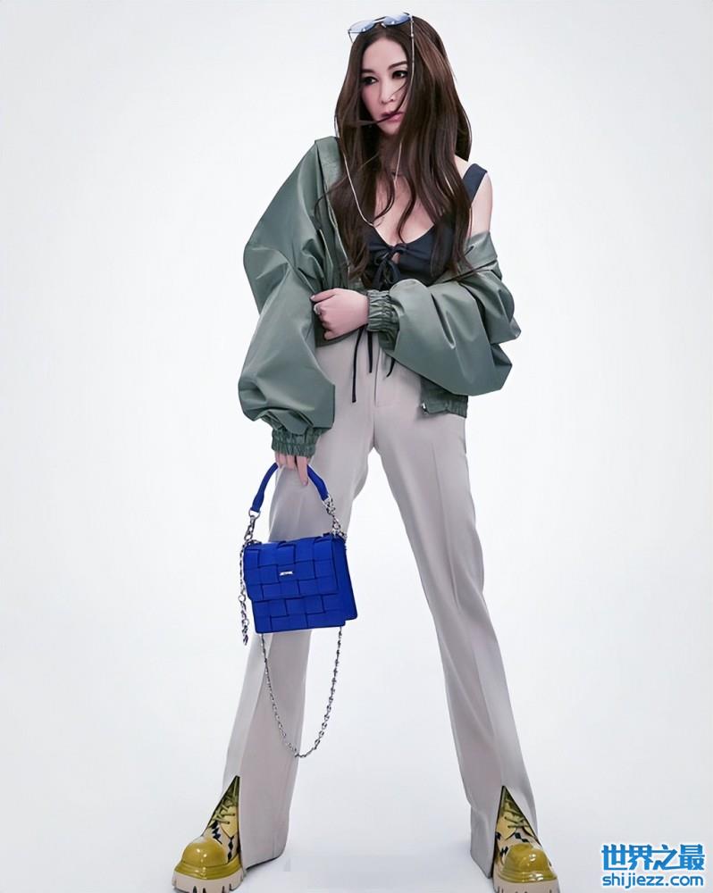 在另一张造型中,画风和前两张又不一样。里面穿着黑色的吊带,胸前仅一根带子连接,外套露出一半的香肩。整体造型之中性感又不失运动系,手上一个蓝色的包包又给整体的暗色系增添了活力。