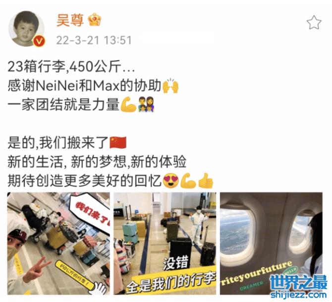 上个月,吴尊就带着一家人定居到了上海,大大小小的行李箱都用了23个,搬来了450公斤的行李。