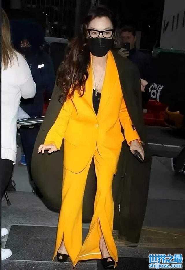 画面中的杨紫琼穿着一身黄色的西装,外面还套了一件黑色的大衣,整个人看起来气场十足。内搭穿着一件黑色的低胸衣,露出傲人事业线。脖子上戴着一条金属项链,给整个造型增添了一份精致感。