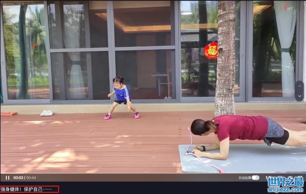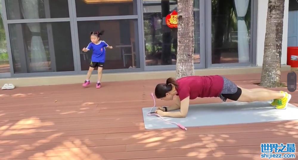 画面中王楠绑着干练的低马尾,穿着红色上衣和灰色紧身裤,露出线条清晰的腿部透出一种力量感。她双手撑在瑜伽垫上,盯着手机的计时器一面喊着倒计时。王楠时不时偏头看向女儿,提醒女儿注意动作的规范性。