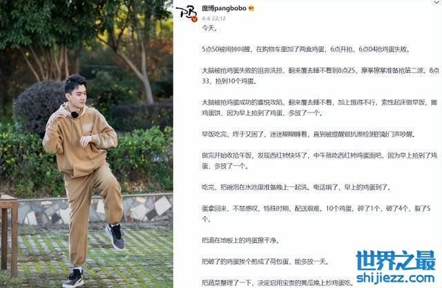 脱口秀演员庞博也是在自己的社交平台上写出了自己隔离期间抢菜的辛酸。他写到每天早上五点过就要起床抢菜,好不容易抢到了鸡蛋没想到收到的10个鸡蛋,碎了1个,破了4个,裂了5个,从他的语气中都能感受到深深地无奈。