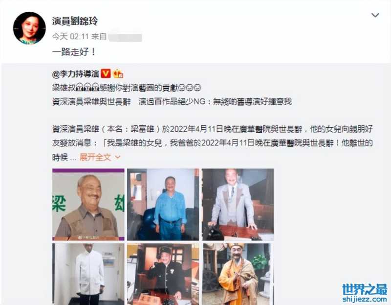 另一个演员刘锦玲,也转发了导演李力持的这条动态。在自己的社交平台发文称希望梁熊一路走好,也在为梁熊悼念。