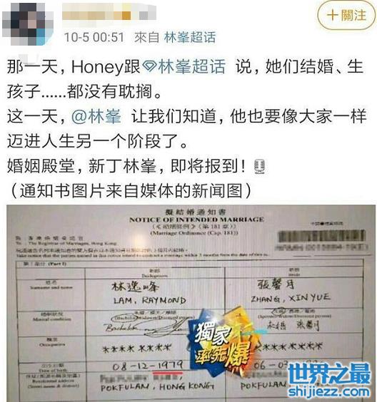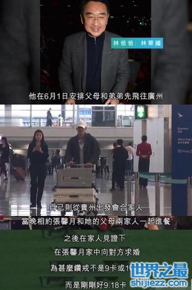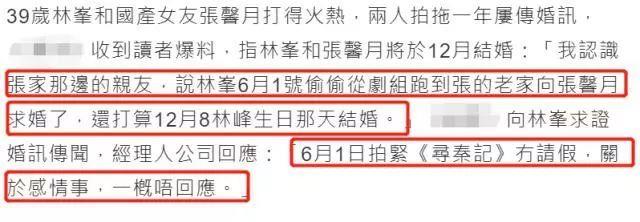 2019年6月,林峯被爆料带着9.18克拉的大钻戒,在家人的见证下,向张馨月求婚成功,