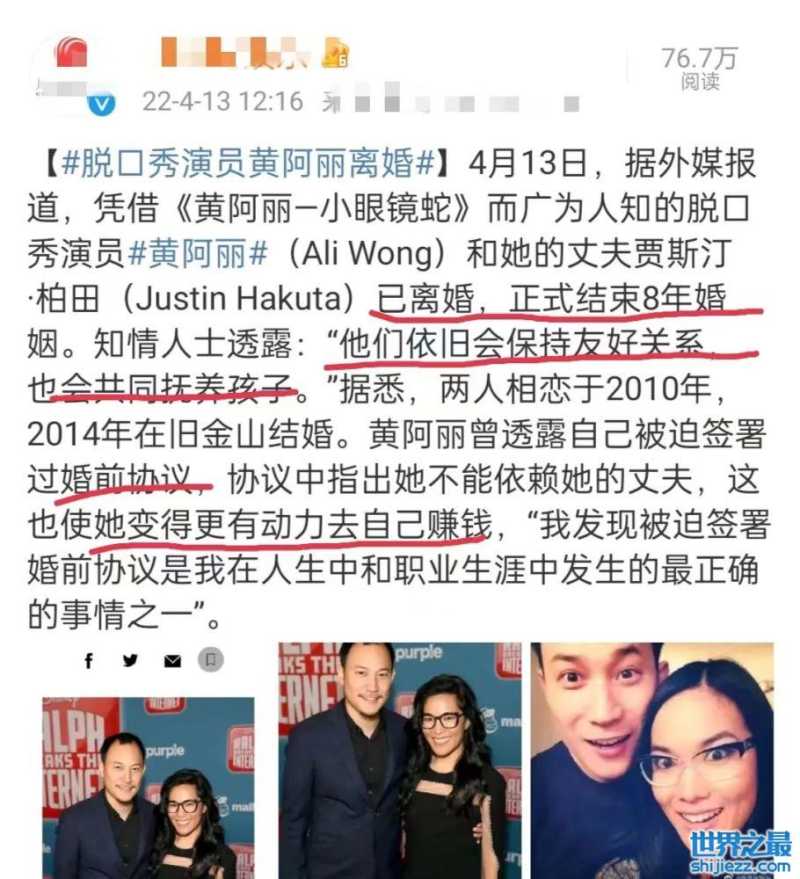 美国著名脱口秀演员黄阿丽,已经和丈夫离婚,两人曾签署婚前协议,知情人士透露,“他们依旧会保持友好关系,也会共同抚养孩子”。