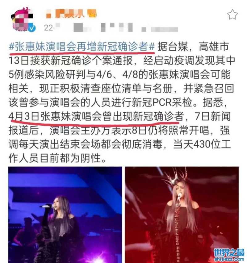 台湾知名歌手张惠妹,演唱会上又出现了新的确诊者,而早在3号的时候,就已经有人在其演唱会上确诊,如今又有了。