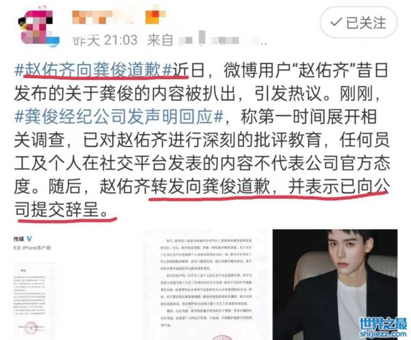 龚俊这段时间,总是处于风波中,赵佑齐,作为龚俊曾经的同事,似乎也牵扯到龚俊的风波中来,目前,赵佑齐向龚俊道歉,并提出辞呈。