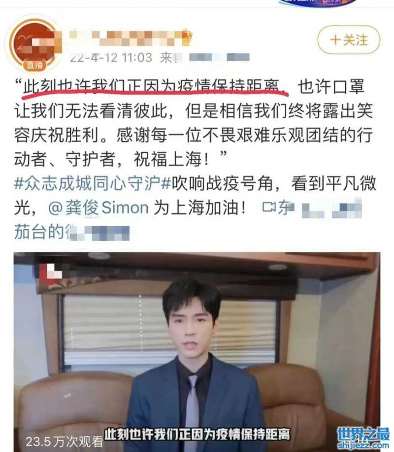 有点意外的是,眼下上海疫情严重,龚俊为抗疫人员加油,并说,“此刻我们也因为疫情,保持距离”。