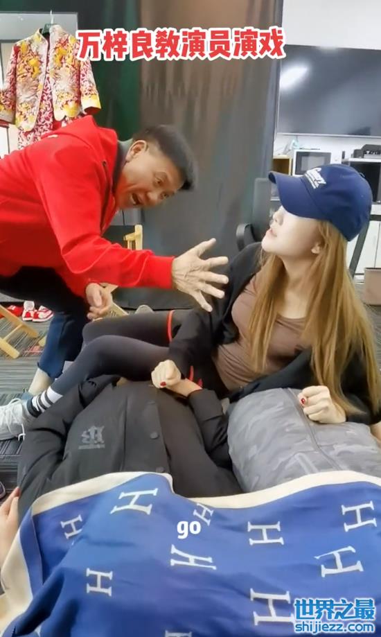 万梓良正在教这位年轻的女演员演戏,他抓住演员的双臂,时不时地晃动着演员的身体,让她尽量往自己这边靠近。而女演员面对老前辈终究还是难免有点紧张,万梓良则笑意盈盈,不停地让女演员放松演戏。