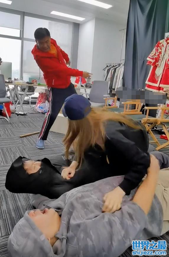 在经过一番拉扯之后,万梓良突然一把将女演员从自己身边推开,直接推到了地上,幸好地上还有两个壮汉充当“人肉坐垫”,女演员这才没有受伤,不过躺在地上的两名工作人员就比较痛苦了,张大嘴巴一脸吃痛的样子。