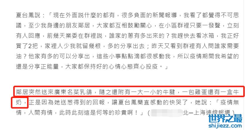 因为邻居好友之间相处足够友善,夏台凤和大家完全打成了一片,一有需求大家就会主动互帮互助解决一些生活中的细小问题。因为夏台凤的一次“送葱”善举,之后邻居还回送了乳鸽牛肉鸡蛋牛奶等一些特殊时期里非常珍贵的食材,让她感动到几乎落泪。