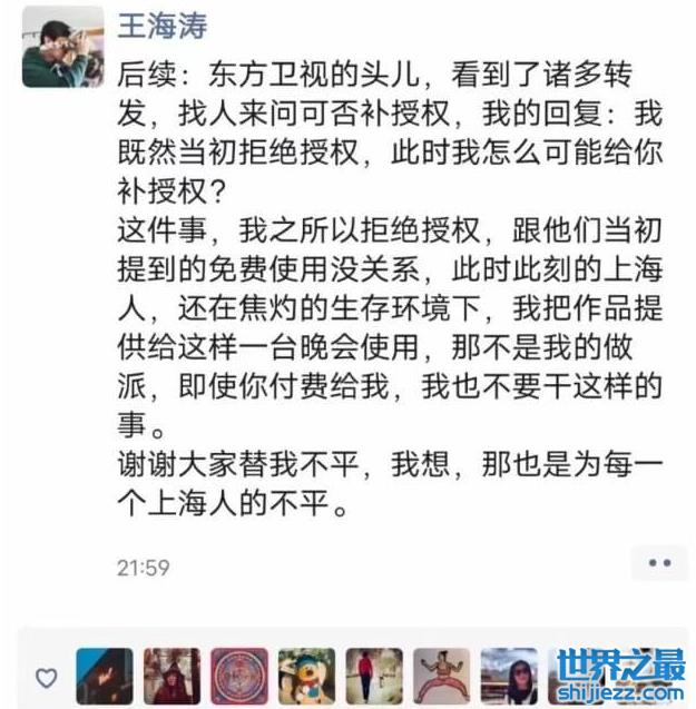 但作者王海涛却意志坚定,让经纪人转告自己的态度,表示无论是免费还是有偿,都不会授权这首歌在晚会中使用,后续还补充说当初拒绝授权更不会补充版权,而之所以拒绝是心系上海当下环境,不想把作品提供给这样的一台晚会使用,但是没想到,东方卫视无视王海涛的态度与意见,在未经对方许可的条件下依然让艺人演唱这首歌,并将其写到节目单上。