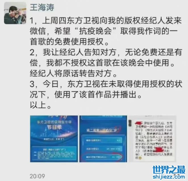 而这首歌曲的词作者王海涛随后发布朋友圈,声称东方卫视曾向自己的版权经纪人发送微信,希望东方卫视承办的“抗疫晚会”能获得这首歌的免费使用权。