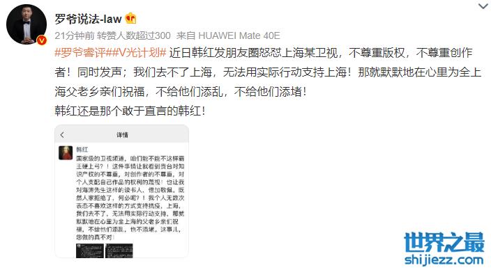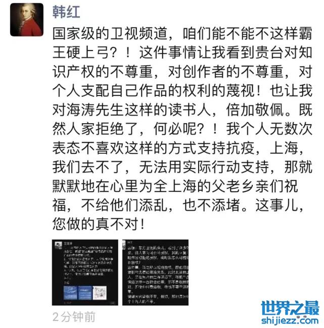 这样一来,东方卫视搞出的这一场“抗疫晚会”更是引起众怒,受到了更多网友的抨击与质疑,事后,疑似韩红的个人朋友圈发布新动态,正直果敢的韩红直接发文怒斥东方卫视这种不尊重作者知识产权的行径,而且还亮出态度表示自己与所带领的爱心志愿队不会奔赴上海,无法用实际行动支持上海市民,为此只能为广大上海的父老乡亲们送上献上祝福。