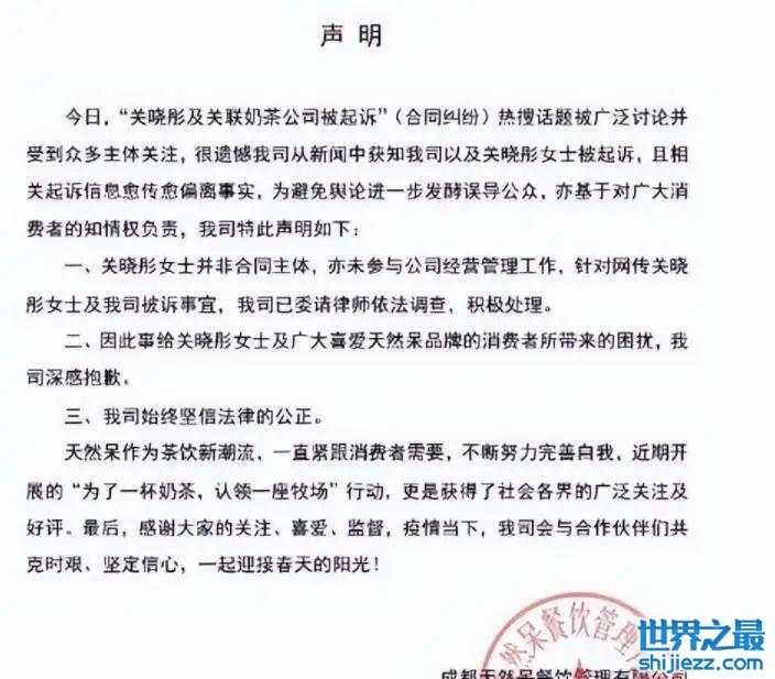 据了解是温州欧哥餐饮管理有限公司在日前起诉了上海至丙品牌管理中心(有限合伙)、成都天然呆餐饮管理有限公司以及关晓彤本人,案件还在审理中。关晓彤的工作室也迅速转发了这条声明,并表示针对人身攻击以及诽谤言论已经委托律师取证,但对于关晓彤与奶茶店的关系,并没有做出任何回应。