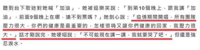在演唱会现场,张惠妹还敞开心扉表示,疫情期间开唱整个团队的压力都很大,毕竟你们的健康才是最重要,对她而言,她希望大家玩得嗨的同时也都能够健康回家,所以她自己的压力也很大,但目前来看,在那么多人确诊后张惠妹依然不考虑暂停演唱会,不知道是不是真的做到了将大家的健康放到首位,说到这个话题时,张惠妹嗨哽咽忍着泪水。
