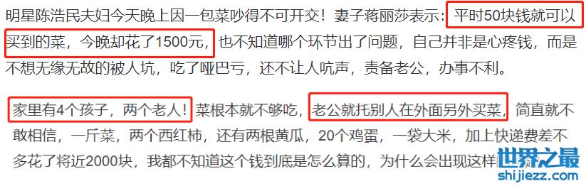 陈浩民妻子蒋丽莎最近在社交平台抱怨,陈浩民花1500元买的蔬菜包太贵了,里面只有20只鸡蛋,两斤蔬菜,一袋大米,几个西红柿和青瓜,平时50元能买到的东西,加上配送费要2000元。