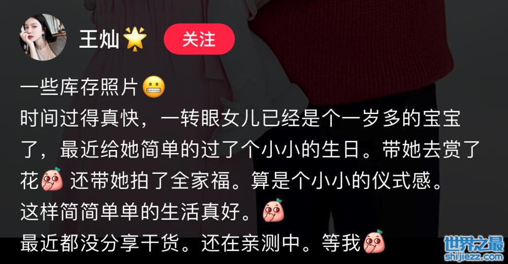 近日,王灿在自己的社交平台晒出了一组照片,并称时间过得真快,一转眼女儿已经一岁多了,最近给她简单过了个生日,不仅拍了全家照还一起出门赏花,也算是小小的仪式感了,这样的简简单单的生活真好。