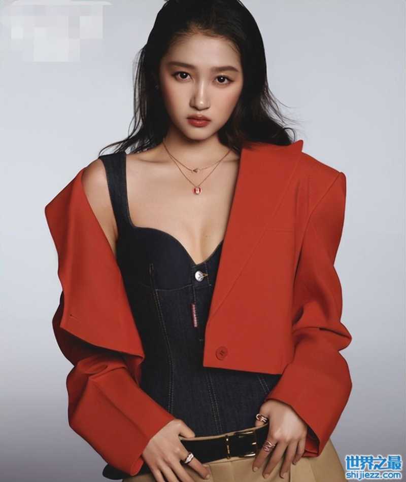 另一株造型更是气场全开,穿着吊带的牛仔上衣,露出傲人的事业线。外面的红色外套露出一半的肩膀,姿势很性感。