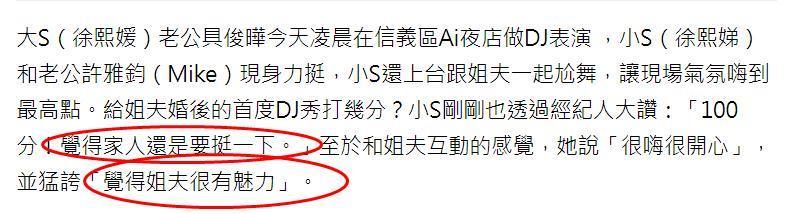 在台北的网友们表示这一次具俊晔这一个新姐夫,是靠实用在Ai Nightclub酒吧之中让大家度过了一个愉快的夜晚。尤其是结束掉首秀之后,小S的经纪人透露小S对新姐夫的首秀打100分,满分。