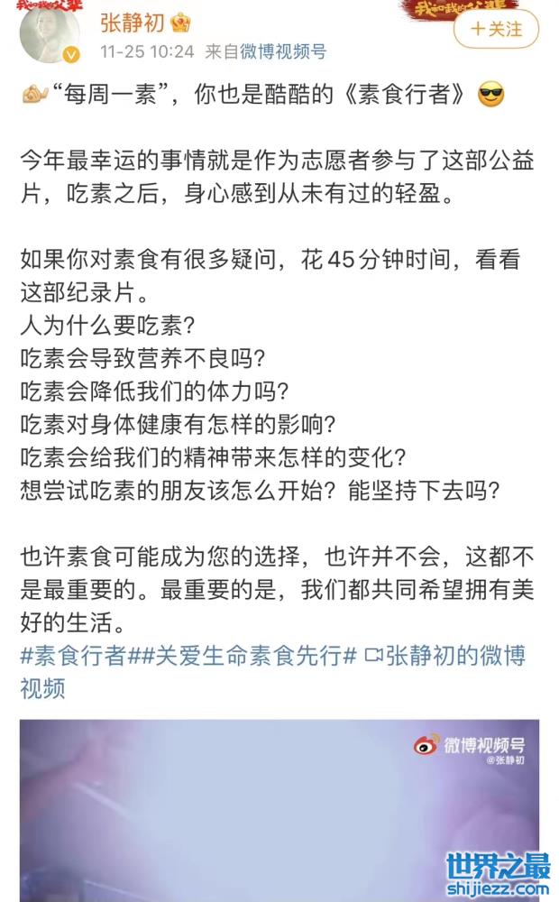 而且张静初还是妥妥的素食主义者,她还曾在微博分享素食主义的纪录片。