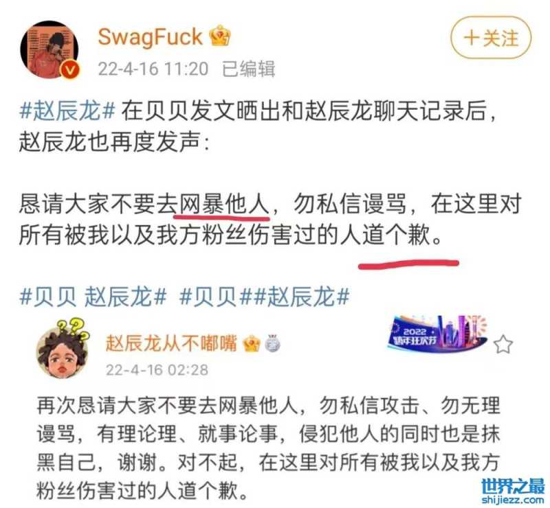 从网上爆出的聊天记录截图来看,赵辰龙因粉丝网暴贝贝,向他道歉。但贝贝却认为对方是在装,还骂其是“绿茶”。