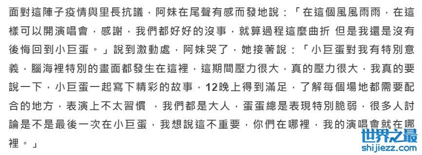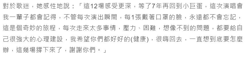 张惠妹在演唱会最后有感而发地说“在这个风风雨雨,还可以这样开演唱会,感谢,我们都好好的没事,就算过程这么曲折,但我还是没有后悔回到小巨蛋”,说到激动处,张惠妹还哭了,她接着说小巨蛋对她有着特别的意义,脑海里特别的画面都发生在这里,这期间压力很大,真的压力很大。但能够开12场演唱会已满足,被问是不是最后一次在小巨蛋,张惠妹还安慰粉丝:“你们在哪里,我的演唱会就在哪里。”