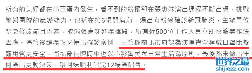 其实张惠妹演唱会进行到第6场的时候,就已公布了确诊者,而到第9场的时候就已有十多位观众确诊,当时不少网友猜测演唱会会被迫终止或者往后延期,但没想到最后三场还是如期举行了,针对这个问题,相关单位认为张惠妹演唱会现场全程都戴口罩比餐厅用餐更安全,也以不影响居民日常生活为原则,最后未作出任何更动决策,让张惠妹顺利唱完12场演唱会。